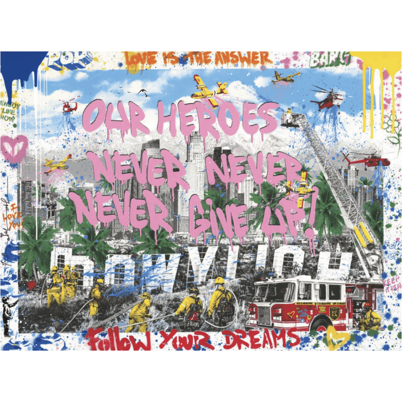 Mr. Brainwash, the pseudonym of French-born, Los Angeles-based artist Thierry Guetta, is a contemporary street artist whose work blends pop culture, graffiti, and appropriation art into bold, playful compositions. Catapulted to fame through his involvement in Banksy’s 2010 documentary Exit Through the Gift Shop, Mr. Brainwash has since built an international reputation for his vibrant and optimistic style. His works often remix imagery from cultural icons such as Marilyn Monroe, Albert Einstein, or The Beatles, reimagined with slogans and bursts of colour that reflect a distinctly urban, pop-inspired aesthetic.